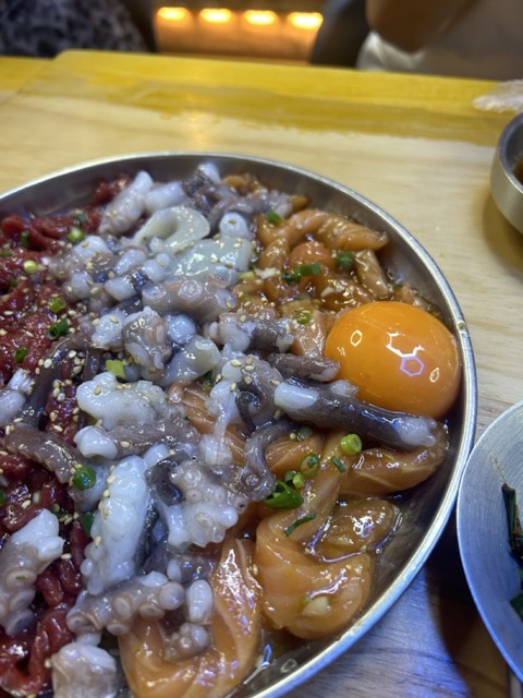 これは、足が動いてる状態のタコを食べるサンナッチという料理と、サーモンとユッケの3点盛りです。